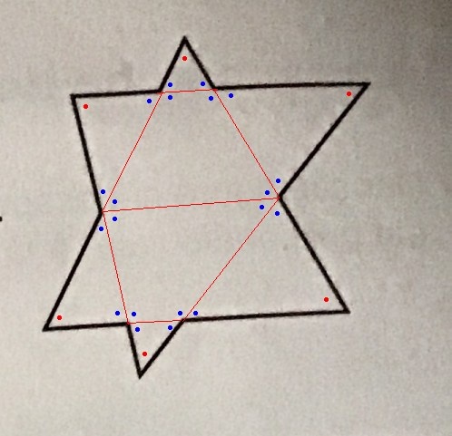 On peut soustraire la somme des angles formant les pointes (rouges) de la somme de la somme de tous les angles intérieurs des triangles et des quadrilatères (bleus et rouges).
