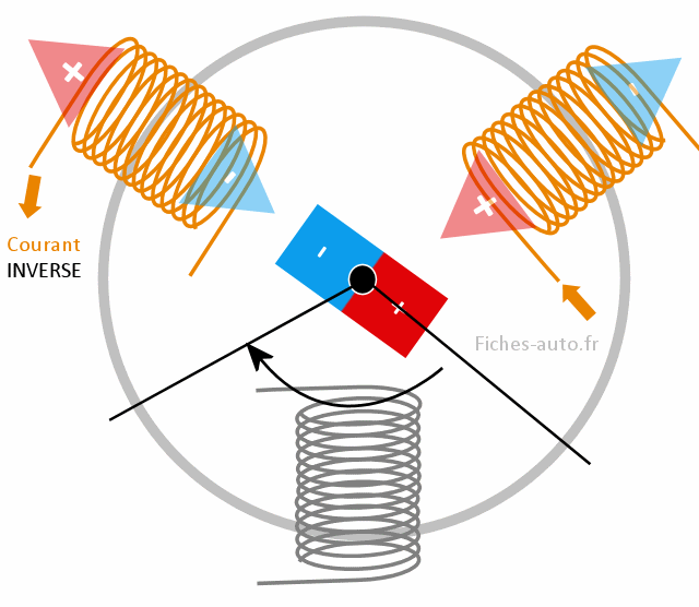 Tu peux donner des coups que sur une partie du bâton pour le faire tourner d'où l'alternance de champs magnétique.