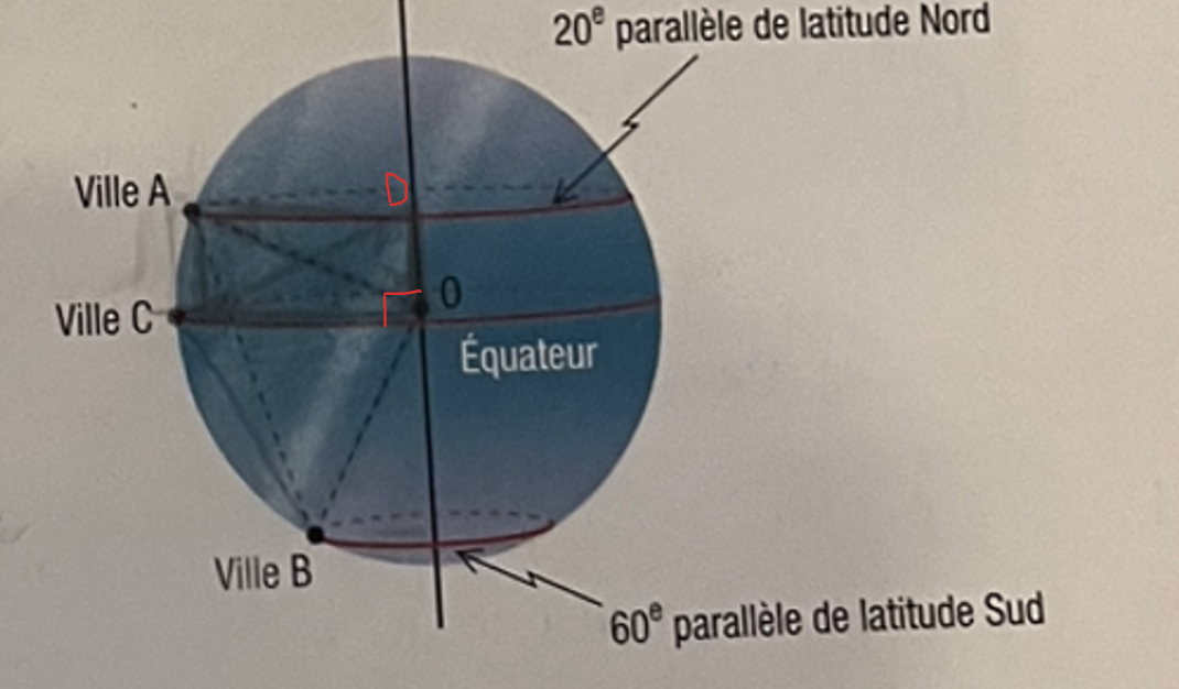 Ici, en sachant que la ligne divisant le globe en deux est perpendiculaire à l'équateur, il est possible de déterminer la présence de triangles rectangles dans la figure.