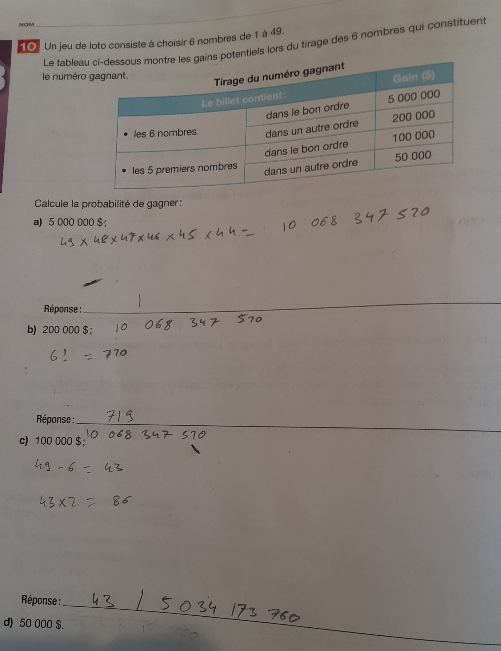 d) Pour gagner 50 000$, je compte les permutations des nombres 1-2-3-4-5-X , il y en a 6! = 720, j'enlève les 2 permutations où je gagne 100 000$, ce qui donne 718 et je multiplie le tout par 43 parce que il y a 43 nombres possibles pour le X.