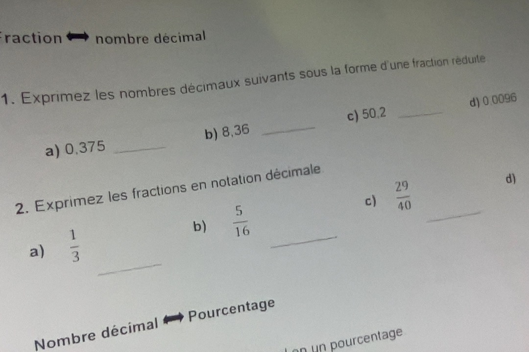 pour le numero 1, les chiffre apres la virgule seront tes fractions, je prend exemple sur ton numéro a: 0,375 c'est 375 millième= 375\1000 apres tu n'as plus qu'à le réduire sur ta calculatrice. pour le numéro 2, tu divise le chiffre du haut par celui du bas et tu as ton nombre décimal!