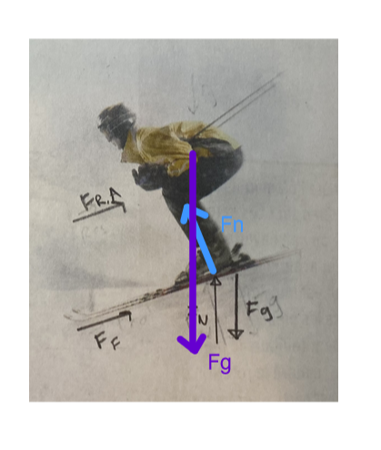 Dans le dessin avec les skieur la force normale est elle la même que la force gravitationnelle. Faut-il que je rajoute le force motrice?