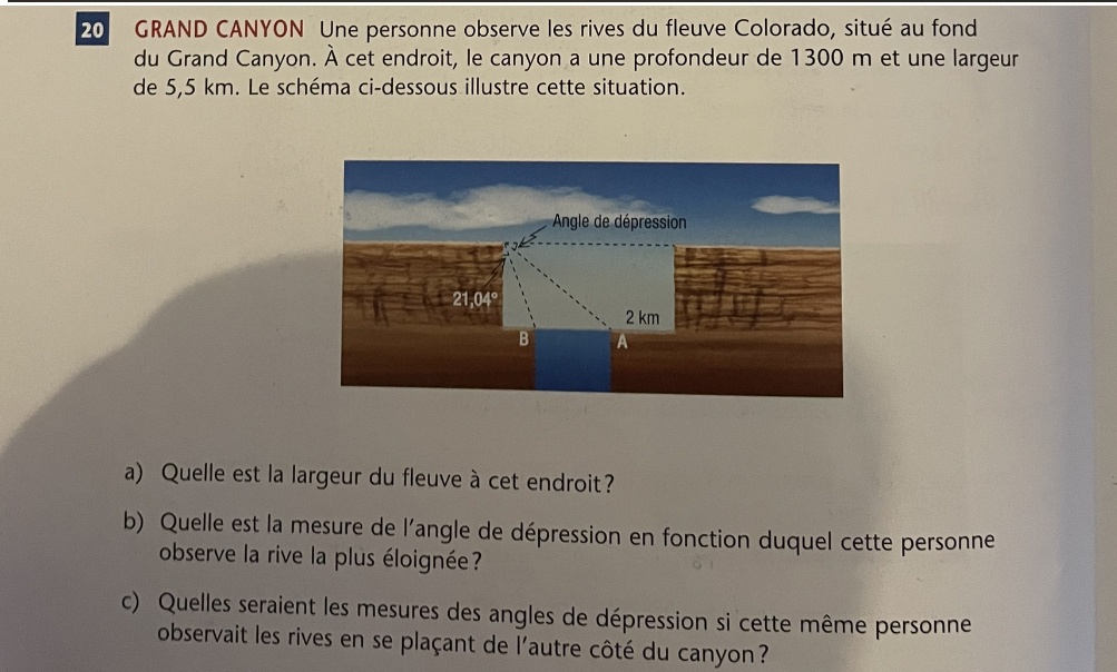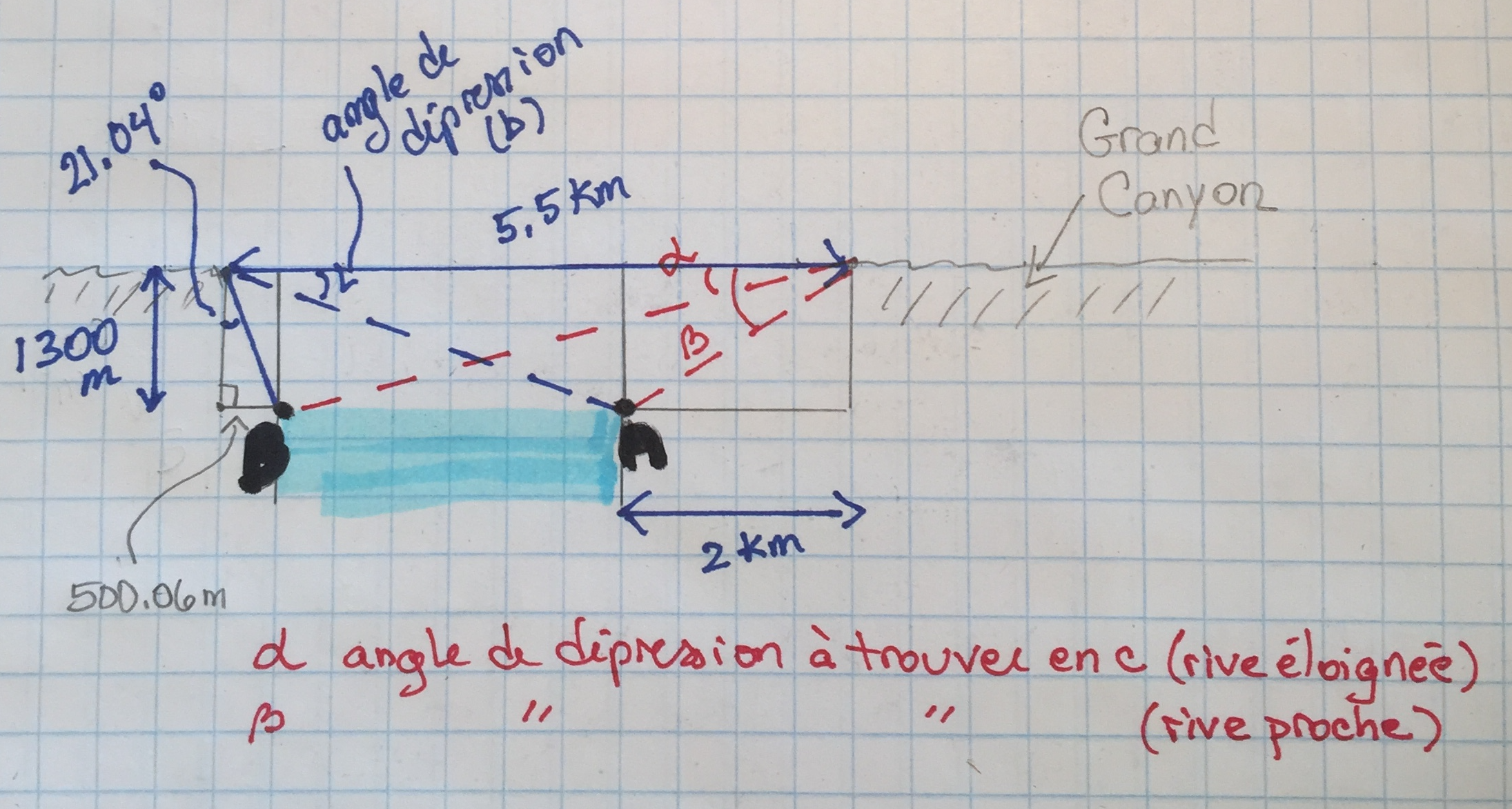 N.B. le fleuve n'est pas de largeur 5.5 km, c'est le canyon qui est de cette largeur. En (a) tu as dû pouvoir établir que le fleuve était de 3km de large (à quelques décimales près)