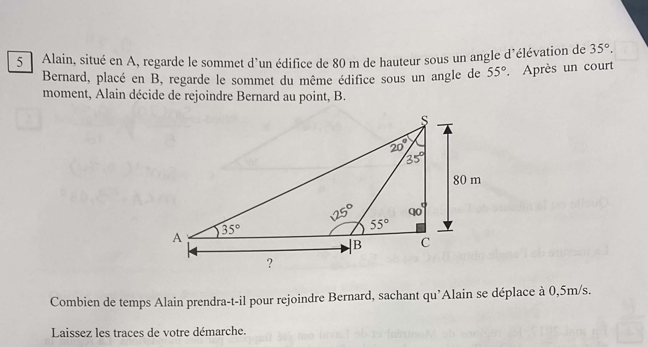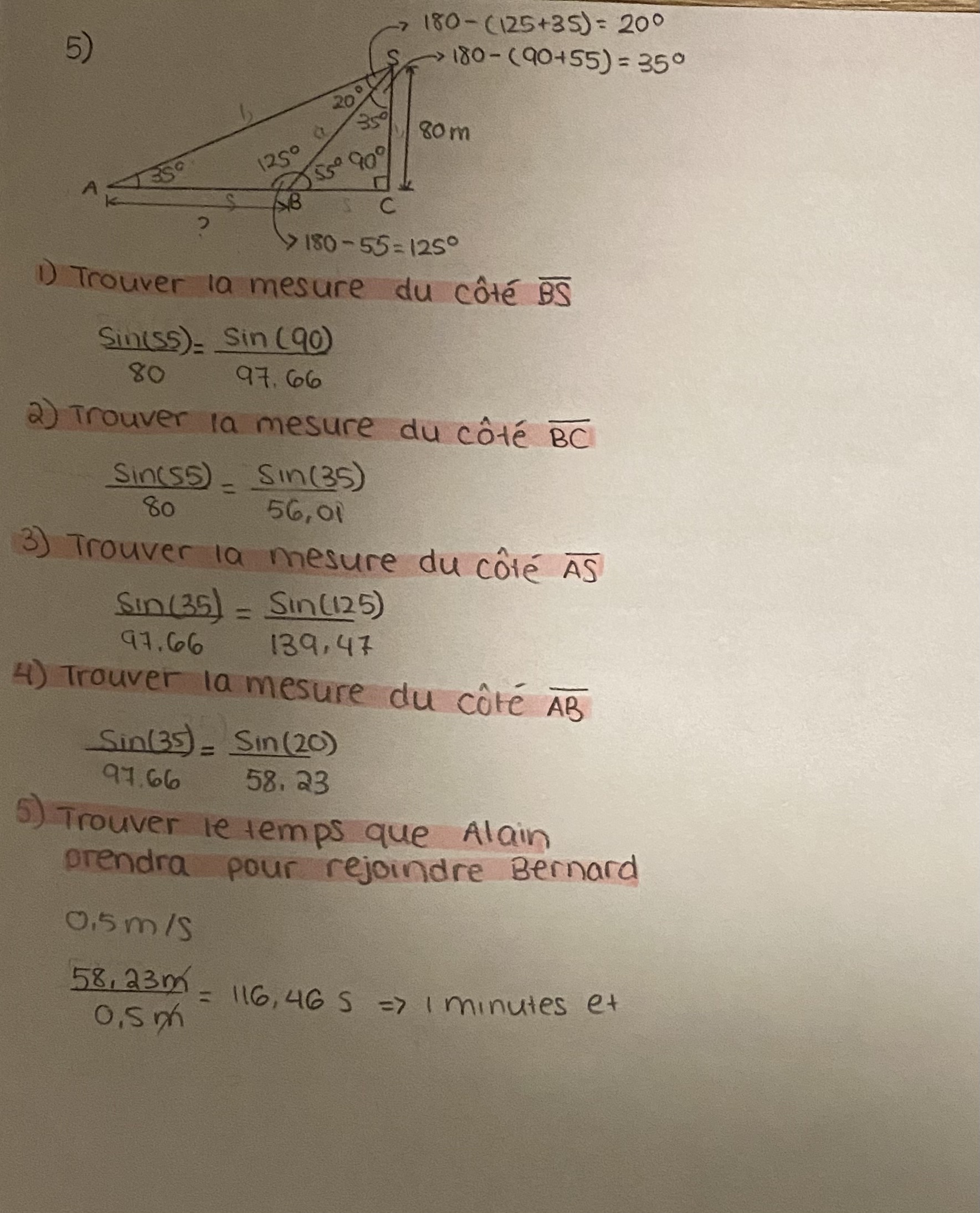 Bonjour, J’ai ce numéro à faire et je ne l’avais pas compris. J’ai tout de même essayer de le faire. Je ne suis pas sure si c’est bon, pouvez vous validez? Et aussi, à la fin du numéro on dit qu’il se déplace à 0,5m/s j’ai calculer et j’ai eu 116,46 s si je le calcule en minute j’ai donc 1 minutes et combien de secondes? Je suis mélanger..