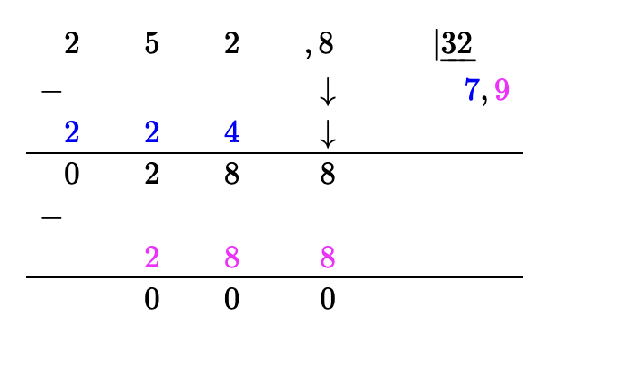 La division à crochet par des nombres à virgules peut se faire, en effet, si la dividende (nombre qui est divisé) est un nombre à virgule: il suffit d'écrire une virgule au quotient lorsqu'on arrive à la virgule dans la dividende.