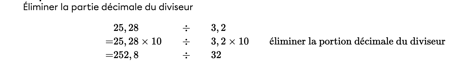 -> Si le diviseur est un nombre à virgules, cependant, il faut le transformer en nombre entier. Pour ce faire tu peux multiplier par 10, 100, etc. Ne pas oublier que si on multiplie le diviseur, il faut aussi multiplier la dividende!