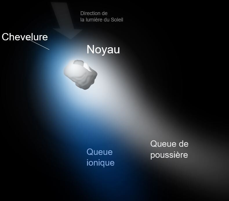 « Le nom « comète » vient du grec komêtês et signifie «astre chevelu». Vue de la Terre, une comète comprend deux parties principales: la tête, formée du noyau et de la chevelure, et la queue, où l'on peut distinguer la queue ionique et la queue de poussières. »