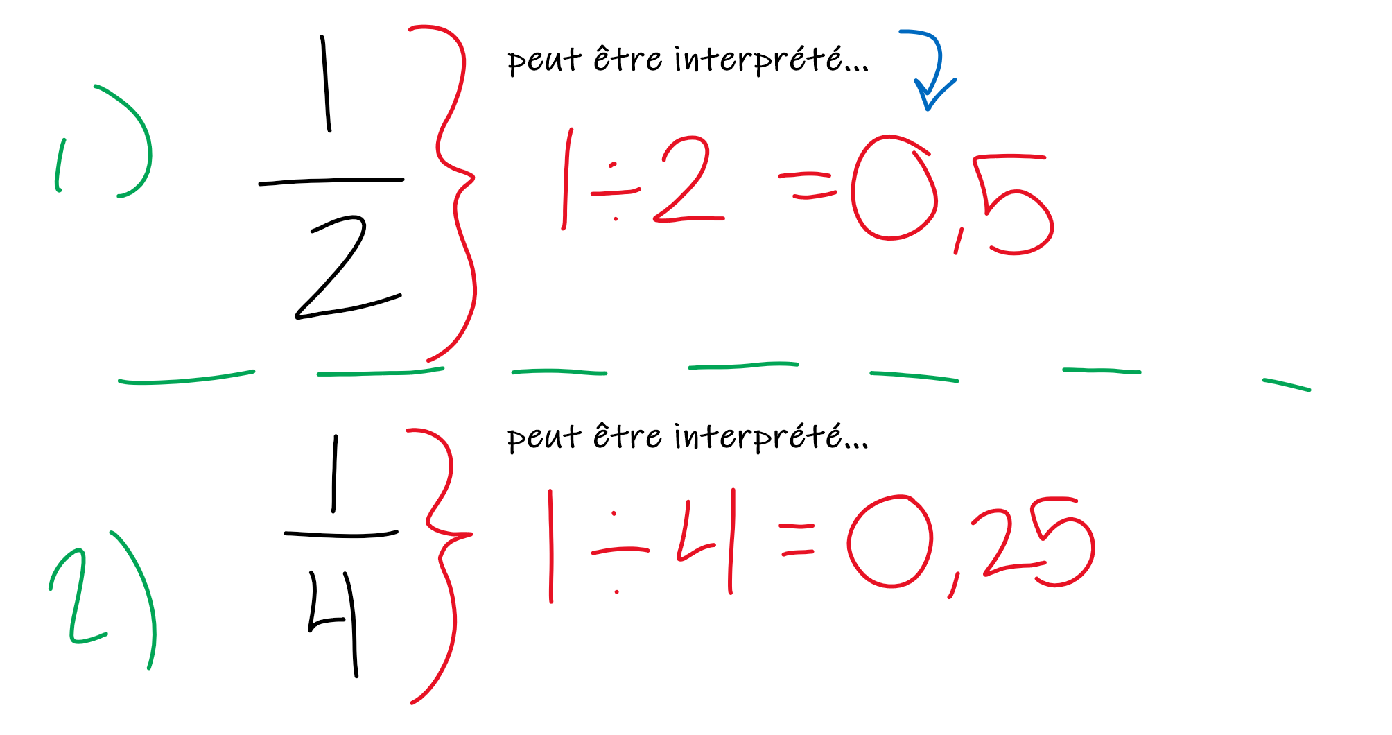 par exemple une demi et 1/2 c’est en fait 1 diviser par 2 et on peut obtenir 0.5 avec une calculatrice.