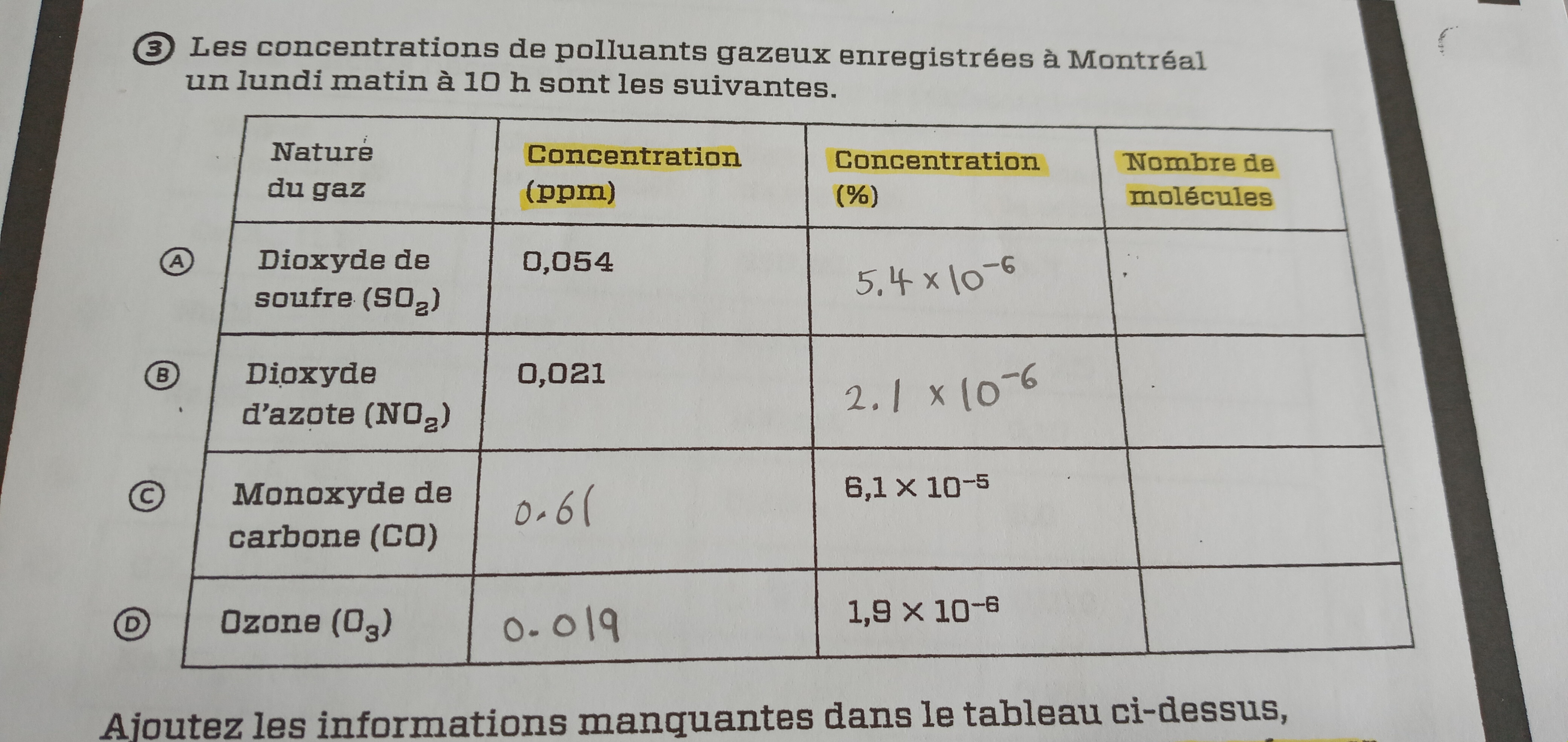 Pour déterminer cette masse, il faut déterminer une masse ou un volume d'air total de référence pour tous les gaz. Par exemple, si on détermine que l'air considéré a un volume 1 L, on y trouvera 0,054 mg de \(SO_2\) puisque \( 1 ppm = \frac{1mg}{1L} \).
