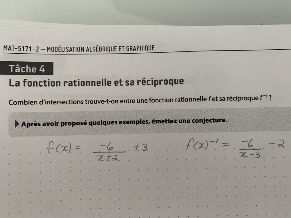 Pourriez-vous s'il-vous-plaît m'expliquer comment je peux démontrer le nombre d'intersections entre une fonction rationnelle et sa réciproque ? Merci