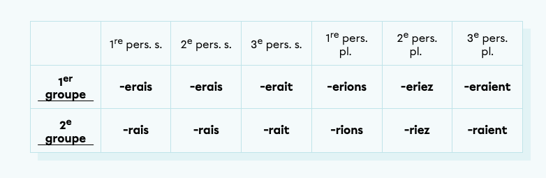 Je regarde les terminaisons du conditionnel présent lorsque le verbe vient du premier groupe (verbes en ''er''): erais ; erais ; erait ; erions ; eriez ; eraient