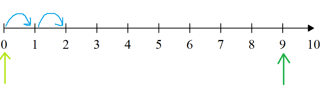 1 unité est représentée par la flèche bleue. Une (1) unité correspond à 1 bond de 1. Ainsi, combien de bonds de 1 pouvons-nous faire avant d'atteindre 9 ?
