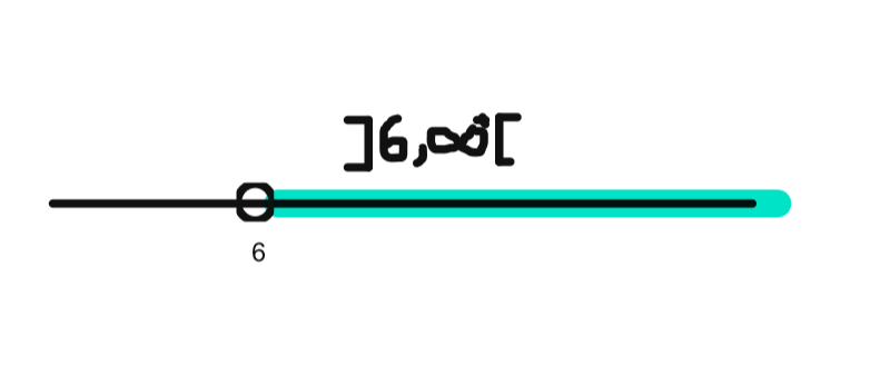 Ici, on a x est plus grand que 6. Ça veut dire qu'il peut aller de 6 (le 6 n'est pas inclus) jusqu'à plus l'infini. On a alors notre intervalle.