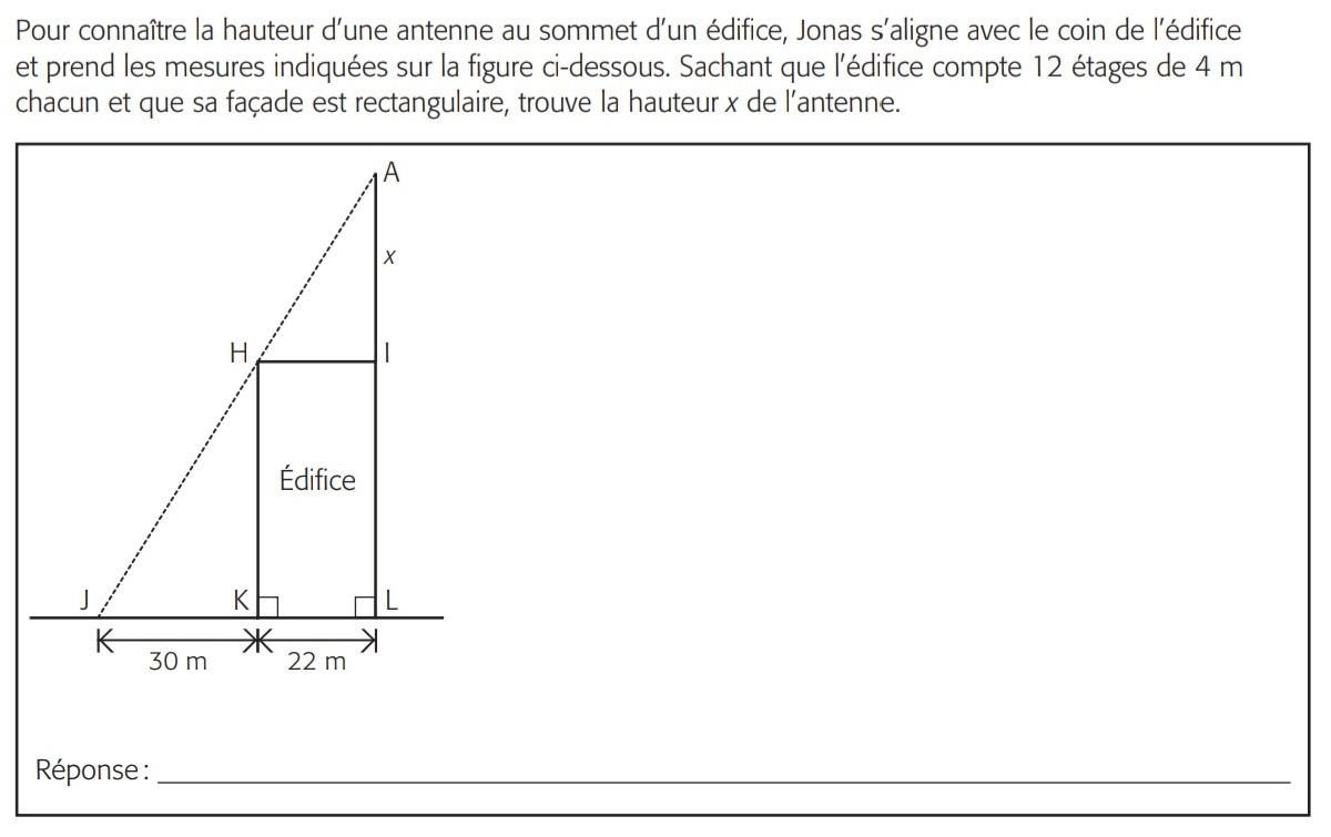 tu peux donc trouver ton rapport de similitude entre tes deux triangle soit 30 divisé par la mesure de JL soit 52m (30+22). Tu obtiendra 1,73. Ensuite pour trouver la mesure AL tu doit multiplier la mesure de HK ( 12fois 4 = 48) par le rapport de similitude.