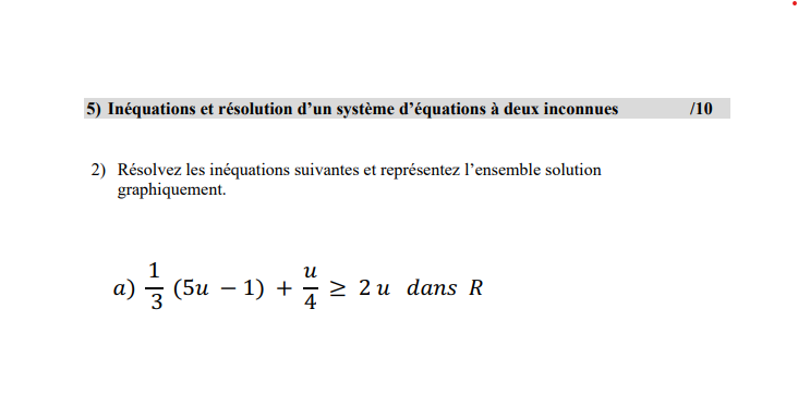 Pour résoudre cette inéquation, tu dois isoler le u dans l'équation. Pour ce faire, tu isoles une variable comme tu as l'habitude, c'est-à-dire en faisant des opérations de chaque côté jusqu'à ce que la variable soit seule. Je vais débuter avec toi!