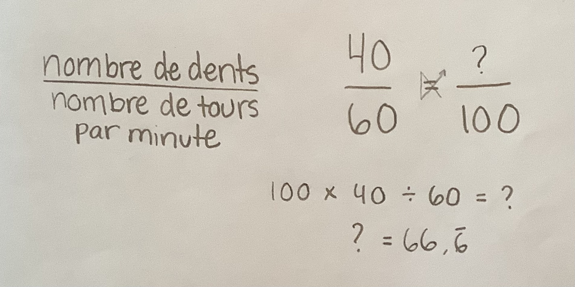 Tu peux commencer par placer un point dans le graphique vis-à-vis le 40 (en bas) et le 60 (à gauche). Il faut comprendre que plus le nombre de dents est petit, plus la roue tourne vite et inversement, plus il y a dents, moins elle tourne vite. Le but est de trouver le nombre de dents que possède une roue qui tourne à 100 tours/minute. Moi je ferais un produit croisé (ou règle de 3) :