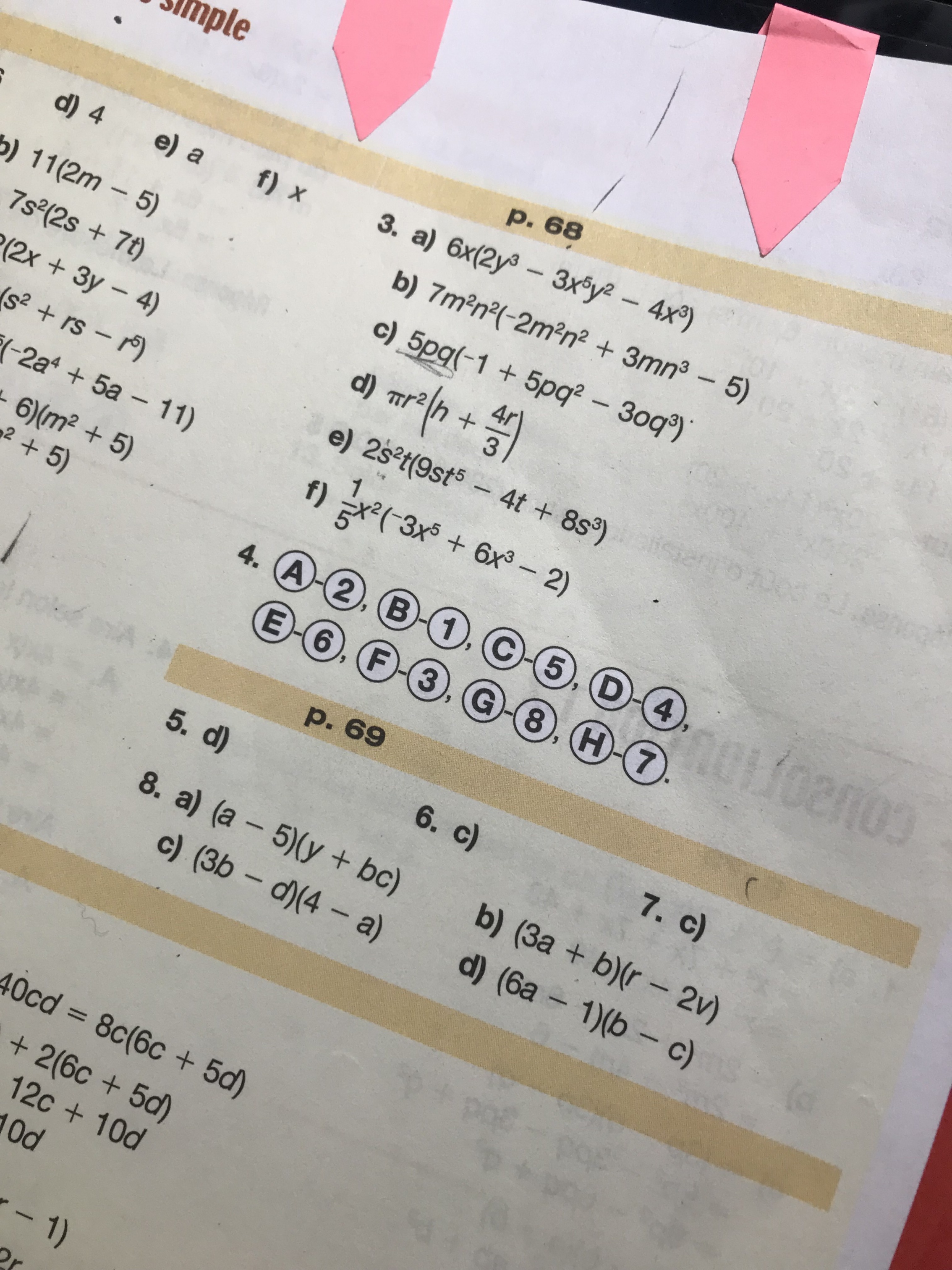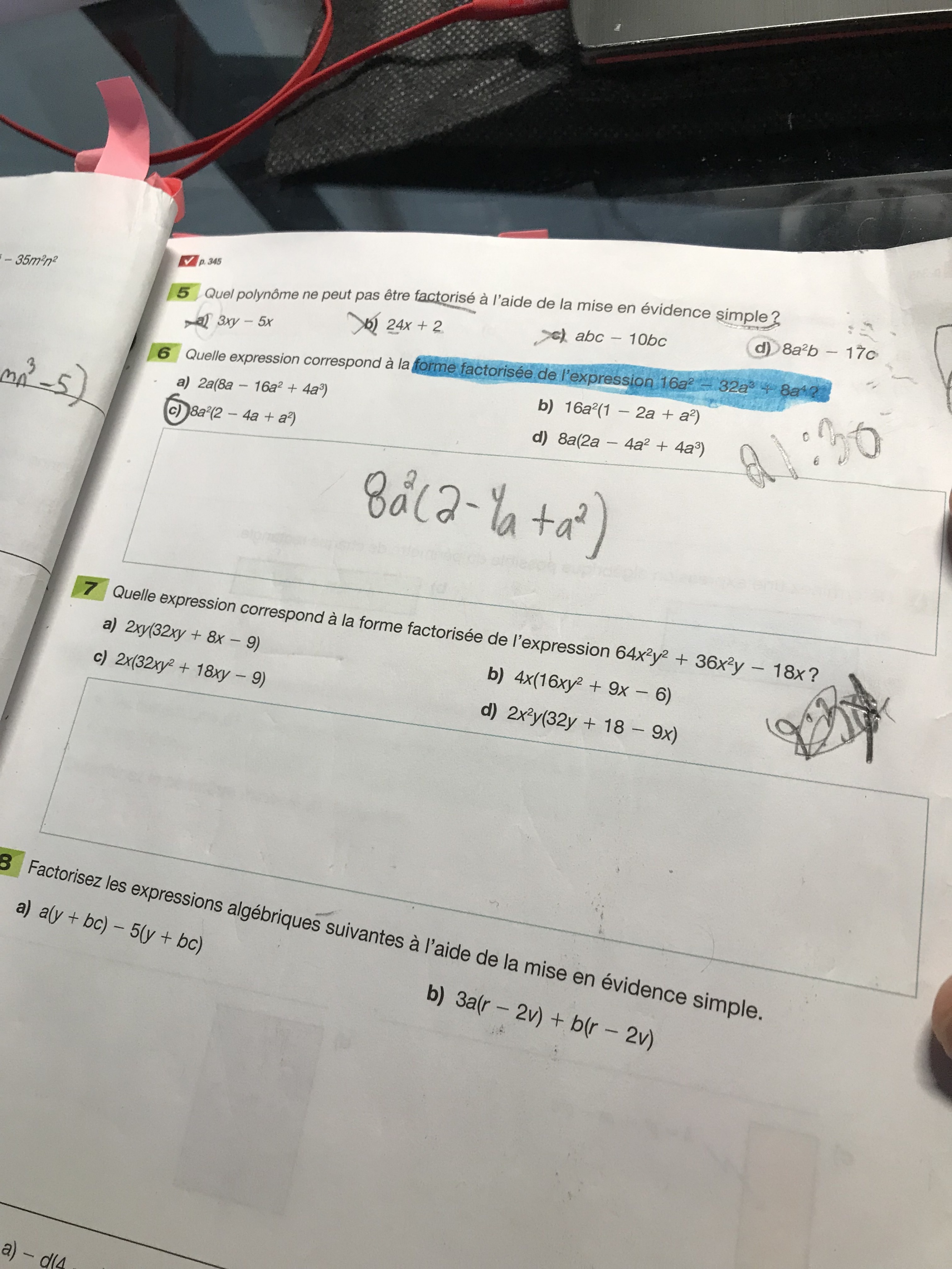 Ainsi, dans ton numéro 8, tu recherches ce qui est identique. Puisqu'il y a des parenthèses, l'addition est comprise dans le terme. Ainsi, tu as deux termes: a(y+bc) et -5(y+bc). En regardant les deux termes, tu vois que les parenthèses sont identiques!