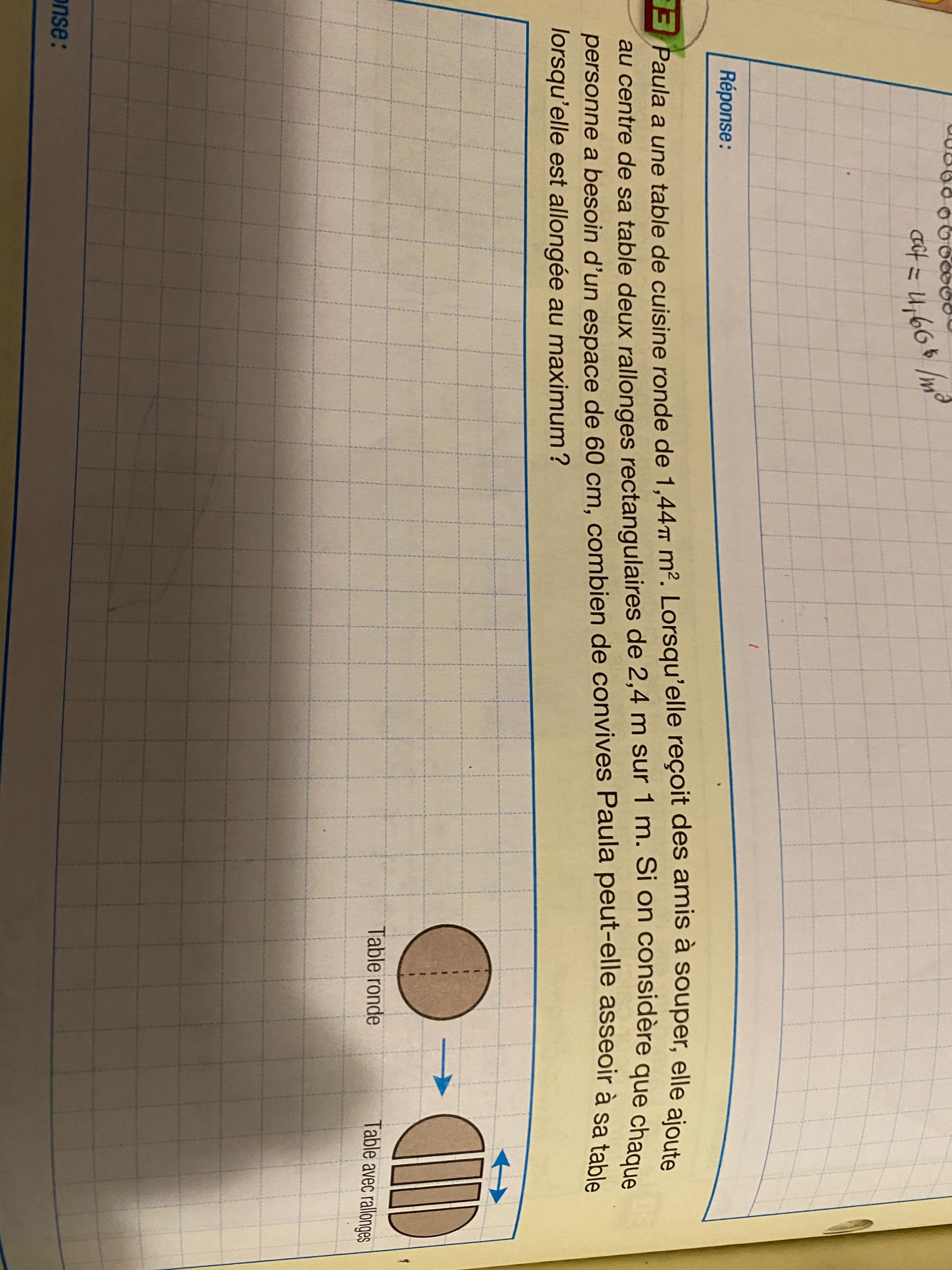On te donne l'aire de la table ronde donc tu peux en déterminer le rayon. On te donne aussi les dimensions des rallonges.