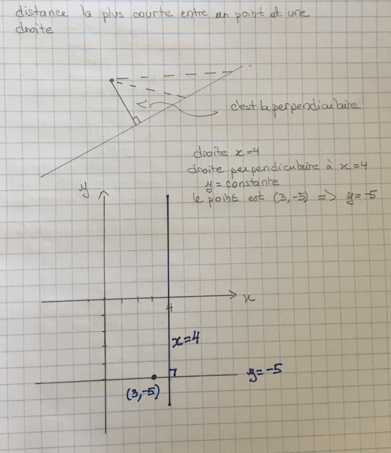 Il s'agit, en général, de trouver le point d'intersection entre la droite imaginaire qui passe par le point donné ayant pour pente l'opposé de l'inverse de celle de la droite donnée, et cette dernière.