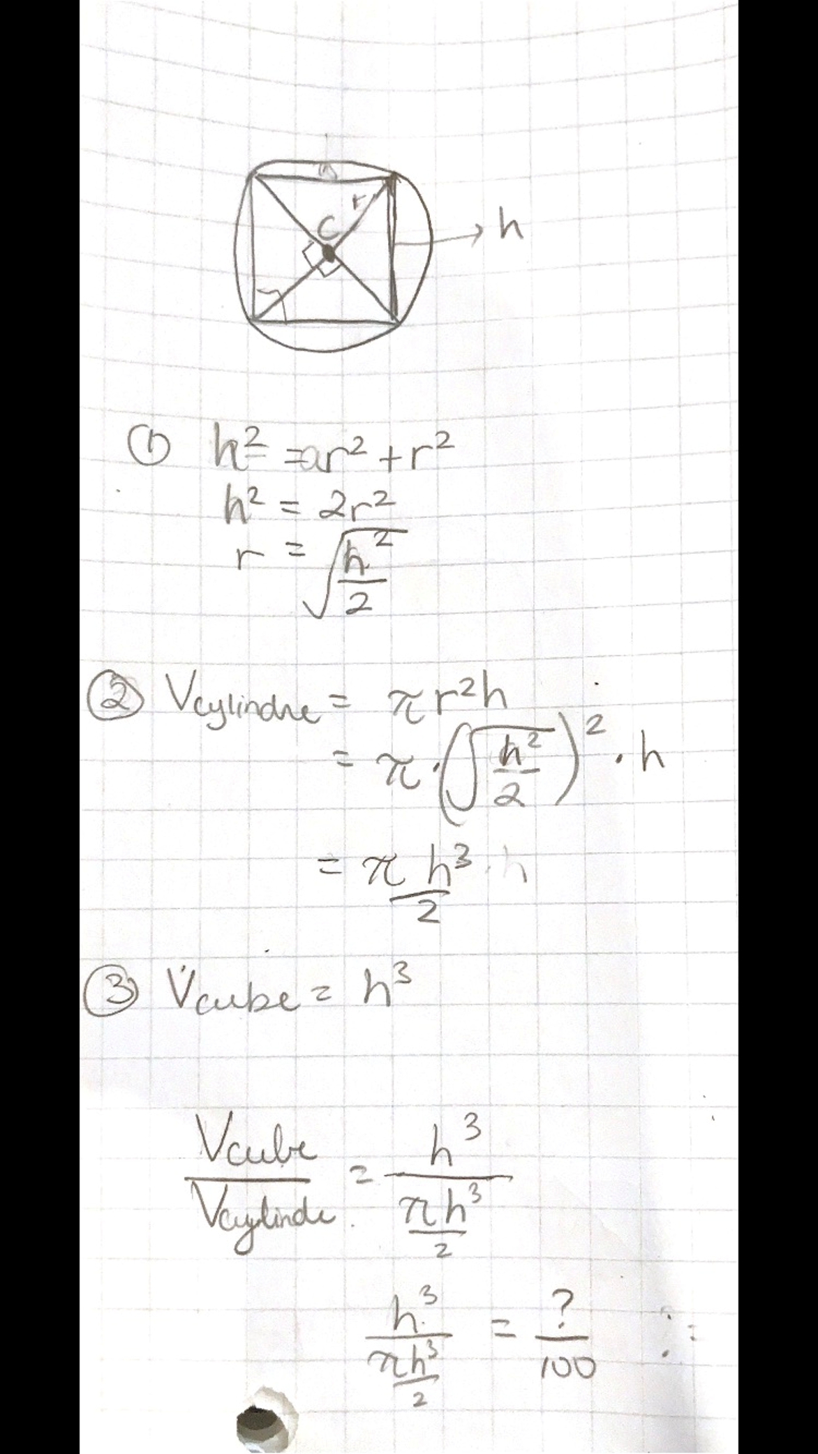 bonjour, est-ce que vous pouvez m'aider a trouver le pourcentage du volume du cube par rapport au cylindre, sachant que le cote est= a la hauteur du cylindre.