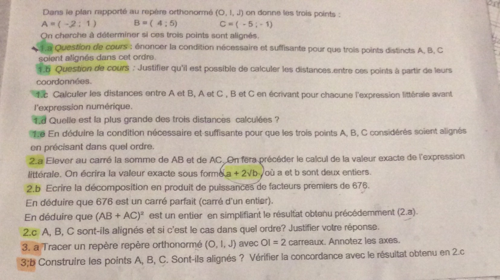 Pour l'alignement des points A, B, C tu peux aussi vérifier qu'ils sont sur la même droite (trouve la droite avec 2 points et l'autre sera dessus)