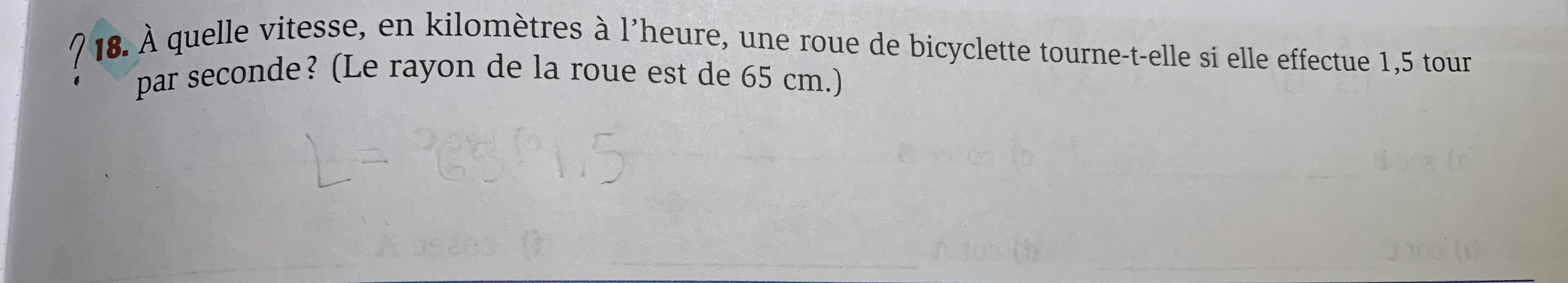 Concernant le numéro 18, on suit le même principe. On sait que 1 tour = la distance de la circonférence. La vitesse est de 1,5 tour/seconde, ou encore 3 tours/2 secondes. En 2 secondes, on parcourt donc une distance égale à 3 fois la circonférence. On peut trouver la circonférence de la roue sachant que le rayon est de 65 cm. Finalement, il ne restera plus qu'à convertir les valeurs obtenues en km/heure.