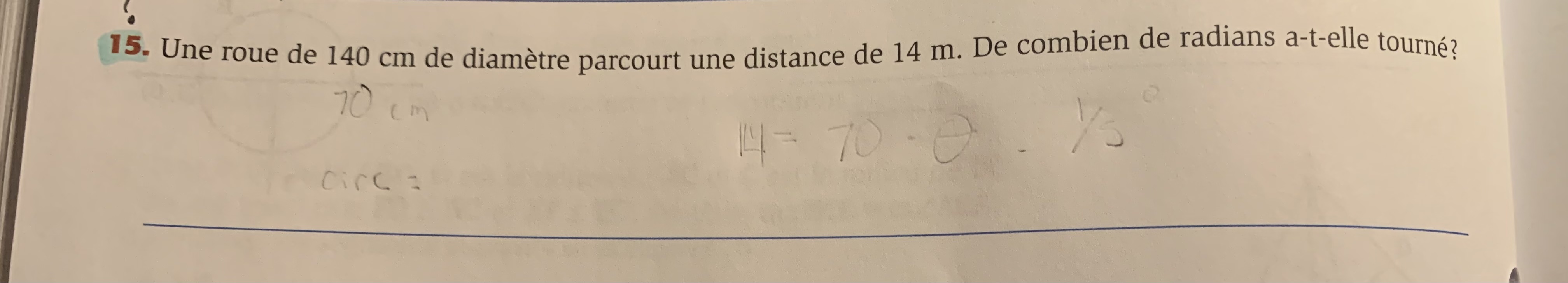 Ensuite, on sait que 1 tour = 2π rad. Il ne reste plus qu'à calculer de combien de radians la roue a tourné avec le nombre de tours trouvé.