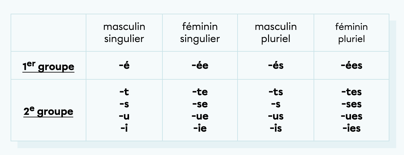 Pour t'aider à mieux écrire les différents participes passés, tu peux d'abord mémoriser leur terminaison. Voici un tableau pour t'aider:
