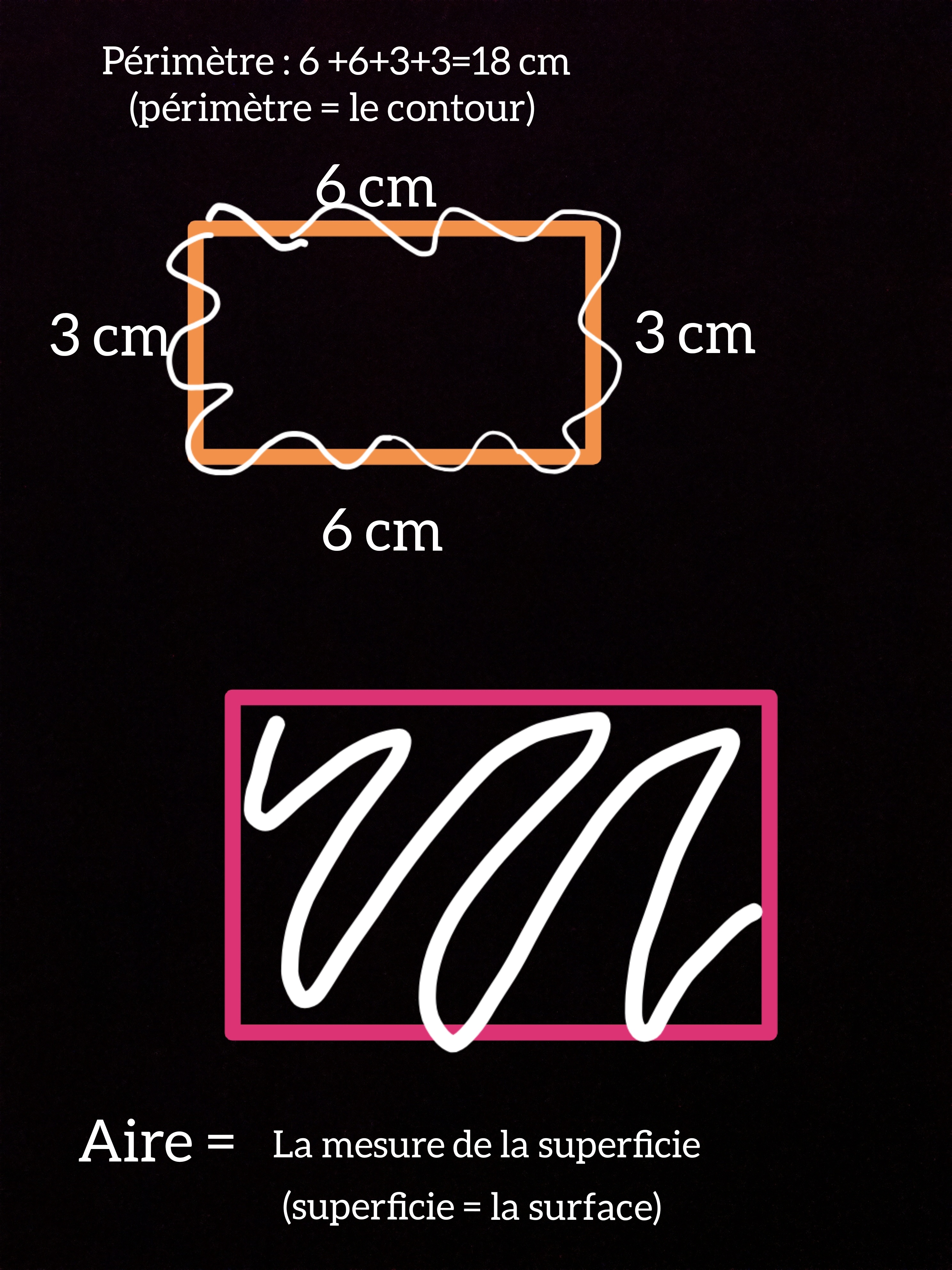 Le périmètre c’est comme le contour d’un cercle et l’aire c’est tout ce qu’il y a dedans