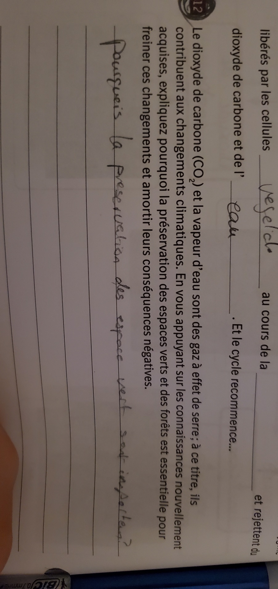 En gros, la question te dit que la vapeur d’eau et le CO2 sont des gaz à effets de serre, ce qui amène le réchauffement climatique. Là, on te demande avec les choses que tu viens juste d’apprendre, pourquoi tu penses que protéger les espaces verts (forêts, places où il y a beaucoup de nature, etc) peut aider à faire en sorte que le réchauffement climatique s’arrête/ralenti.