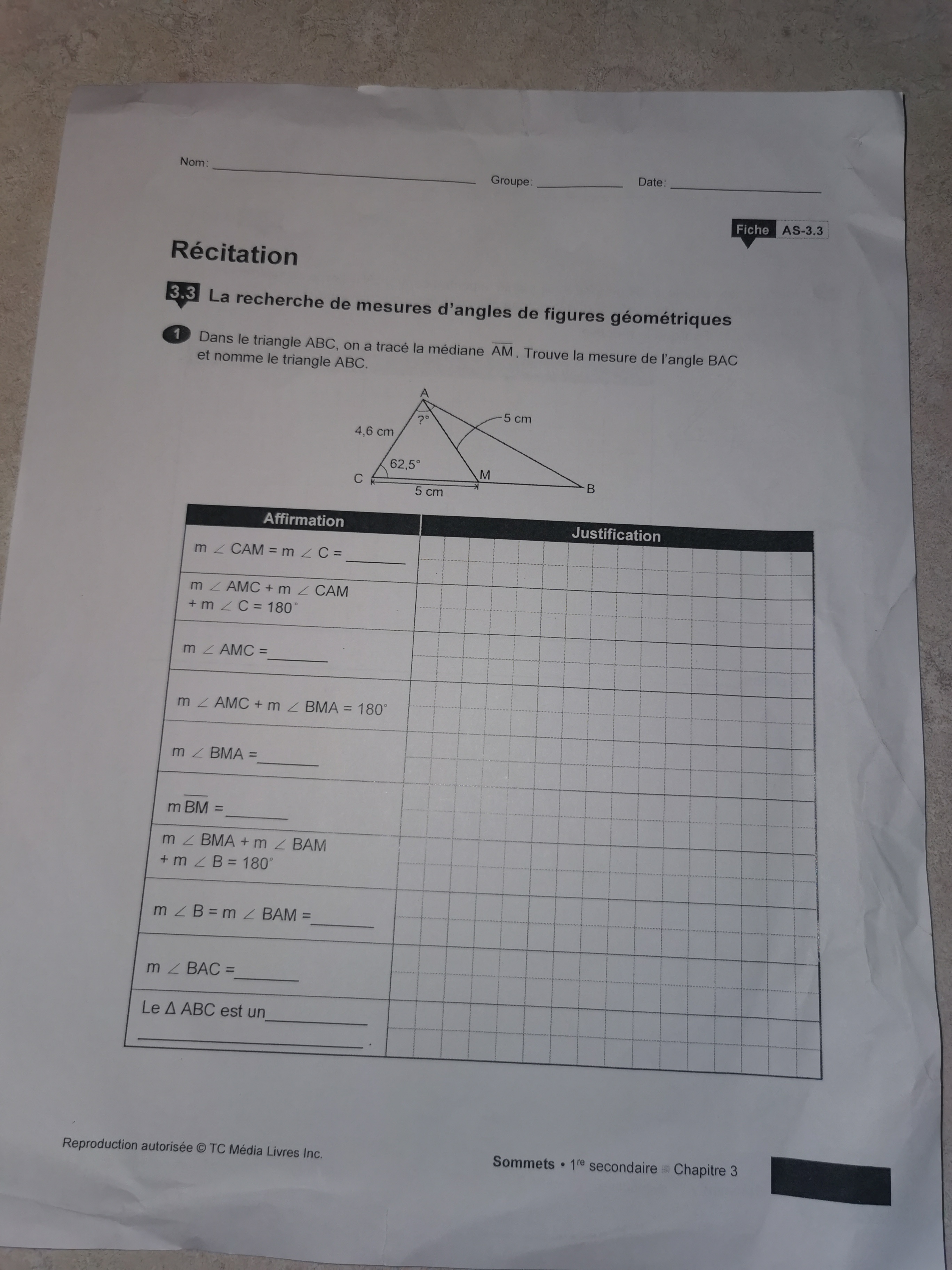 Le premier triangle c'est un triangle isocèle donc il a deux côté égaux donc L'angle A et l'angle C donc l'angle A= 62,5° et l'angle total d'un triangle =180° donc 180°-(62,5×2)=55° là on va dans le 2° triangle toujours un isocèle et il l'angle m du premier triangle est de 55° donc 180°-55°=125° donc l'angle m du deuxième triangle = 125° et comme je le disais tout à l'heure l'angle d'un triangle c'est 180° donc 180°-125°=55° et les angles A et B sont égaux donc 55°÷2 = 27,5 et l'an A au complet = 62,5°+27,5° voilà on a eu le même devoir today donc je t'explique comme je peux j'espère que ça va t'aider !