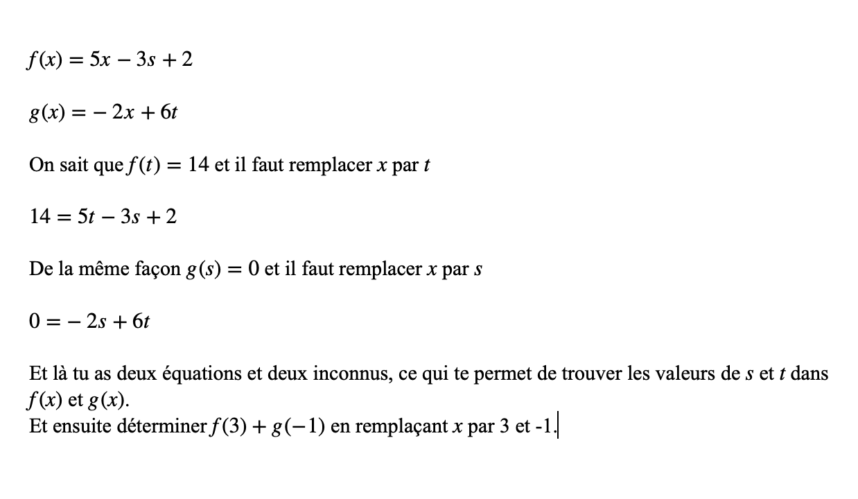 5t - 3s + 2 = 14 est une équation à 2 variables. Il nous faudra donc une deuxième équation avec les deux mêmes variables, afin de former un système.