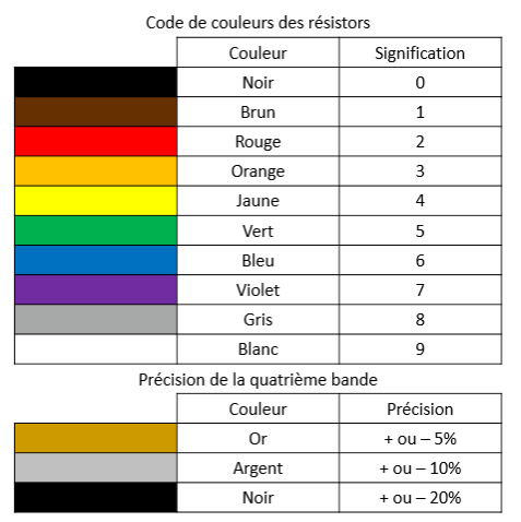 • La quatrième bande donne la précision de la résistance, c’est-à-dire le pourcentage d’erreur (la marge d’erreur de la résistance).