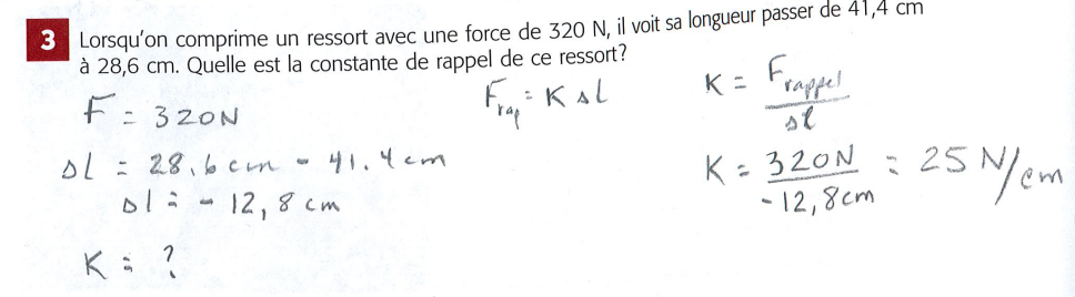 Je me demande pourquoi la constante est négative (-25 N/cm) dans mes calculs. Est-ce que la force est négative quand on comprîmes? Ou est ce que je mets un signe négatif dans la formule? Dans le cahier, il n’y a pas de signe devant le k