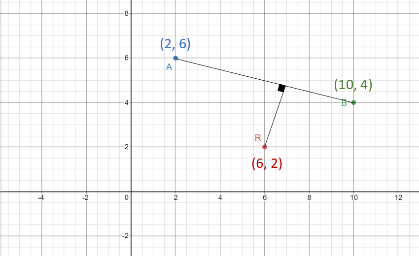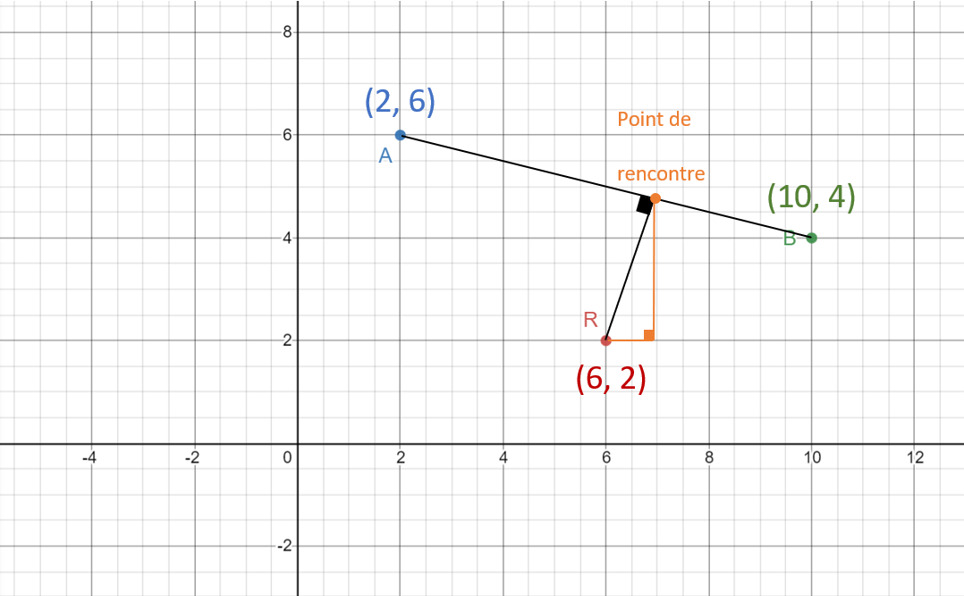 Le voici : Une cabane est constituée au point R(6,2) près d'une route AB qui relie deux terrains de camping situés respectivement au point A(2,6) et B(10,4). Détermine la distance la plus courte de la cabane à la route AB. Chaque unité du quadrillage de la carte représente 1 km.