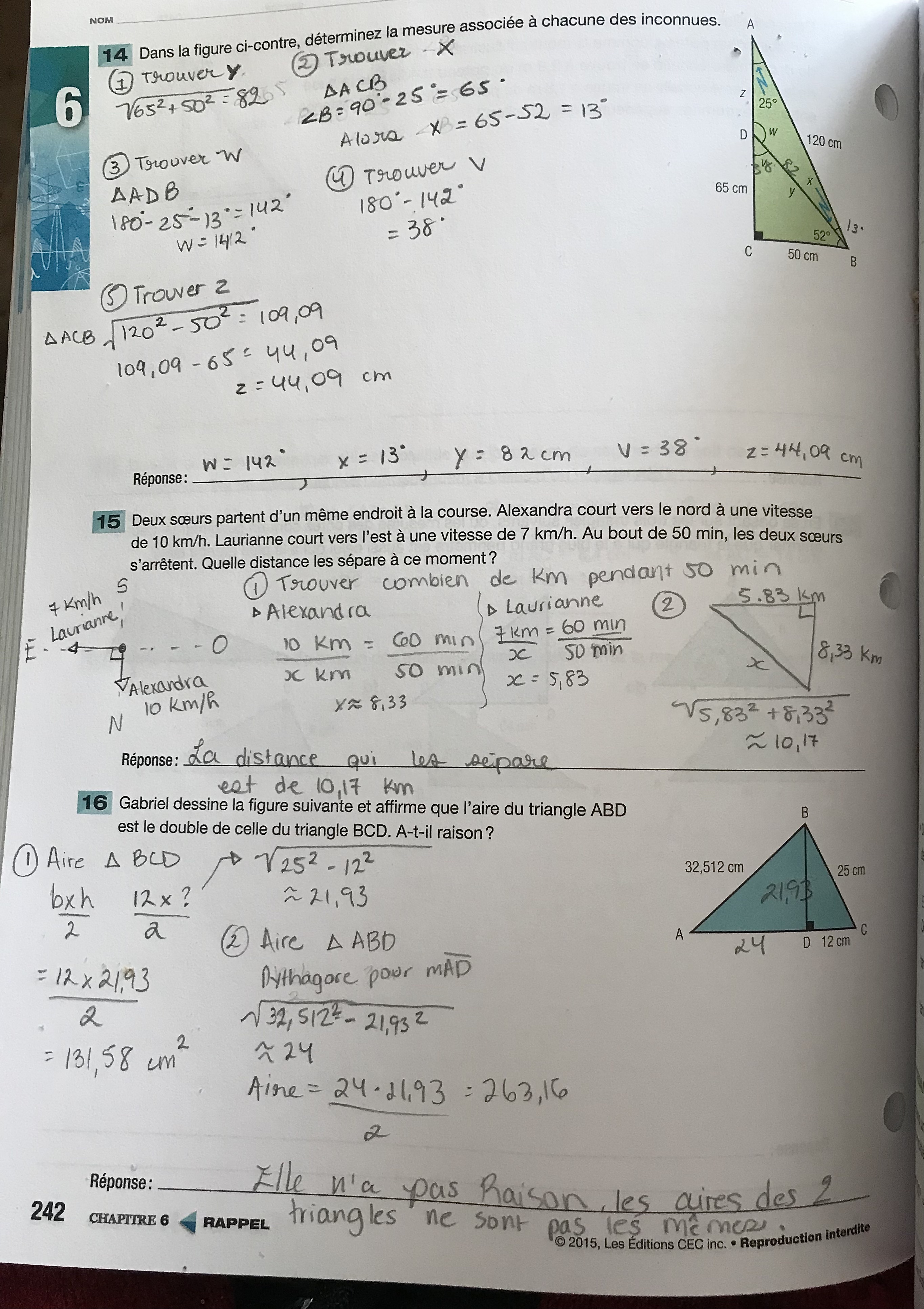 De plus, pour le numéro 3, je pense que tu as seulement mal lu la question. On te demande de vérifier si l'aire du triangle ABD est le double de l'aire du triangle BCD. Tu as trouvé les bonnes aires pour les deux triangles, il ne reste plus qu'à vérifier si 131,58 cm² est bien le double de 263,16 cm² ;)