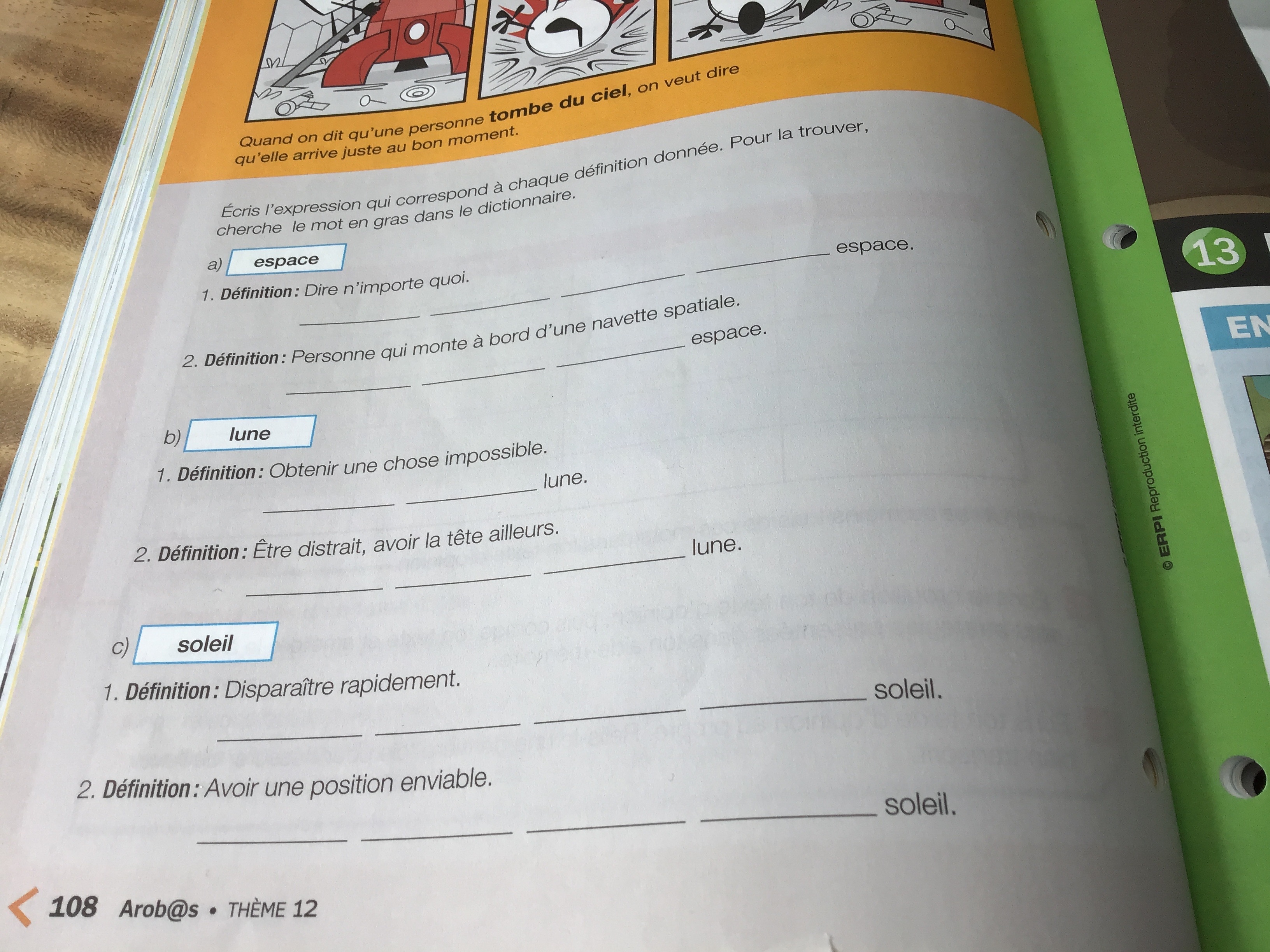 Malheureusement, il n'est pas possible pour nous de te donner toutes les réponses. Lorsque tu chercheras dans le dictionnaire, tu pourras y trouver chacune des expressions. C'est parfois long au début de chercher les mots, mais en te pratiquant, ça deviendra de plus en plus rapide, il ne faut cependant pas être dans la lune ;)
