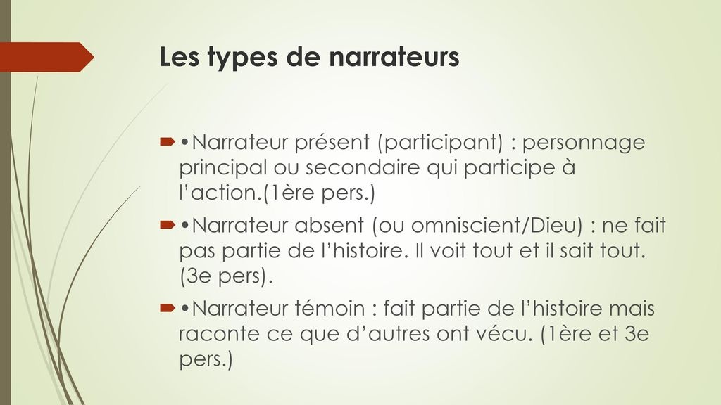 Il existe trois principaux types de narrateurs qui apportent tous une perspective différente au récit :
