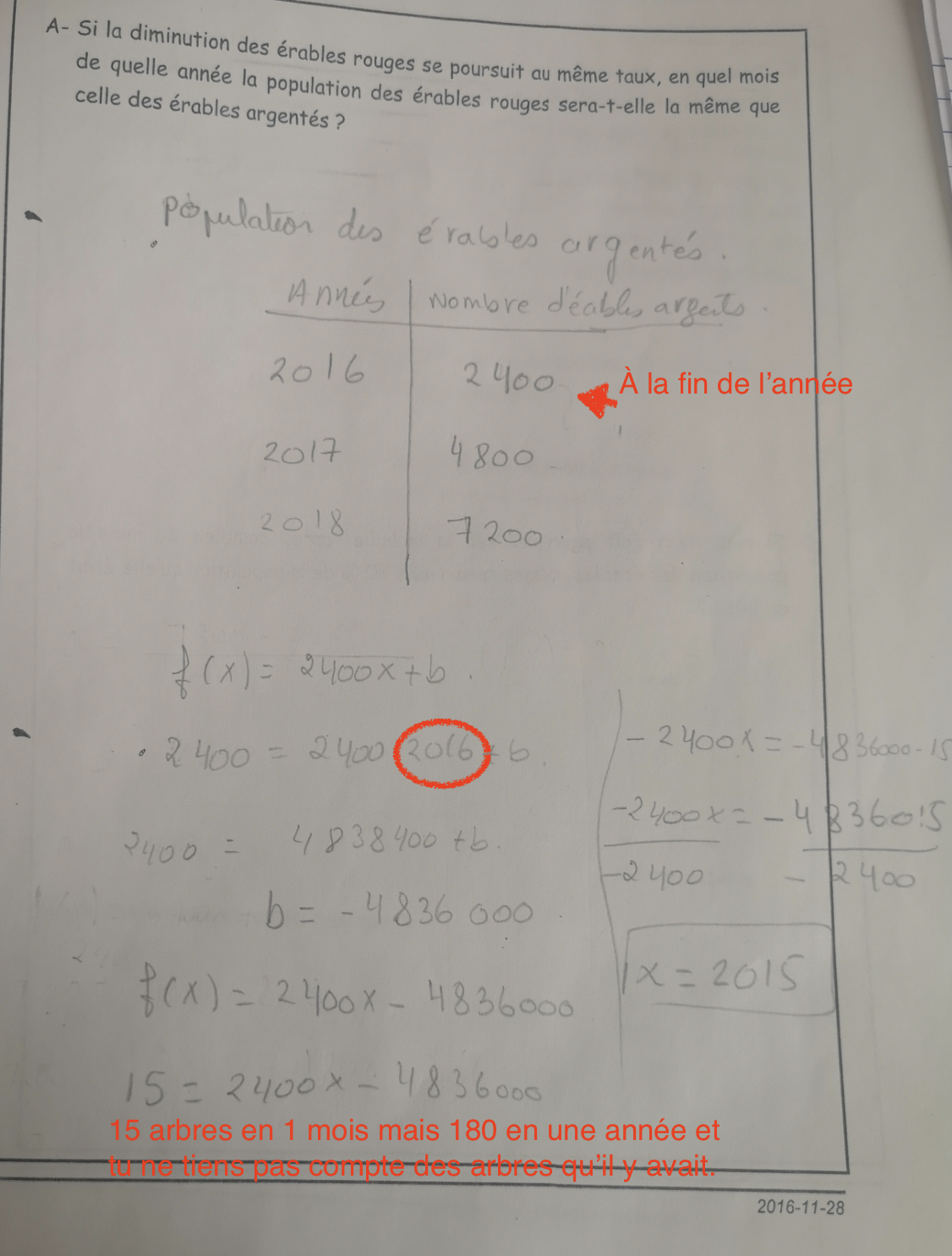Si f(x) représente la population d’érables rouges et que x représente le nombre de mois à partir de janvier 2016 alors on détermine les valeurs de m et b dans f(x)=mx+bÂ