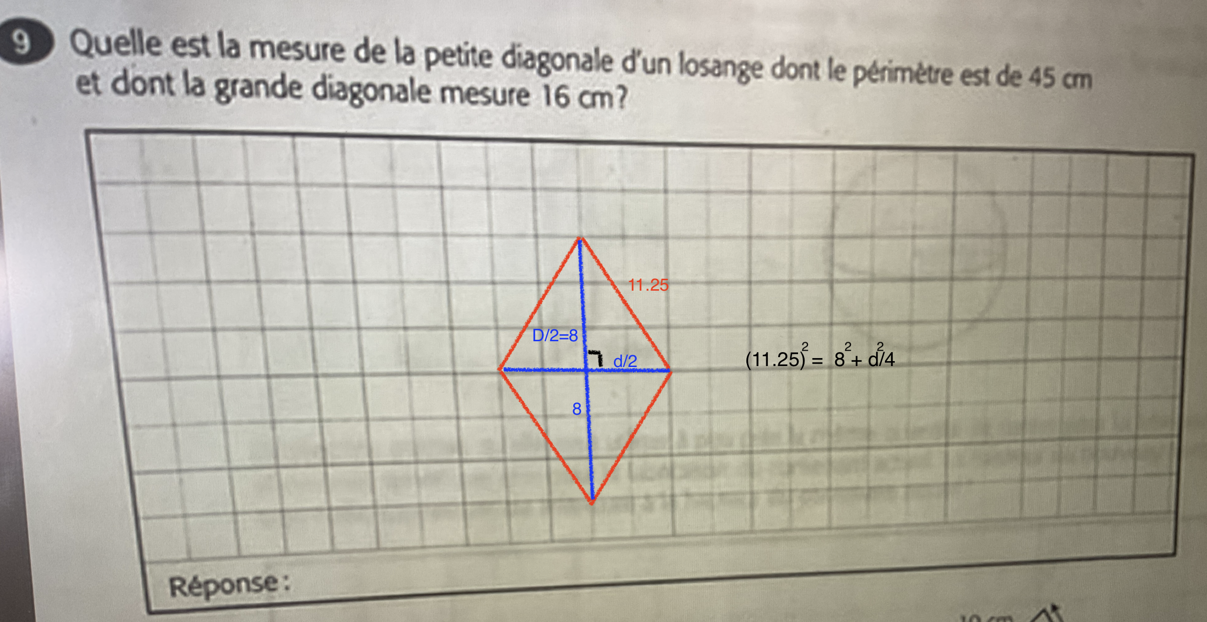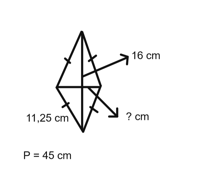 Grâce au périmètre, on peut déterminer la mesure d'un côté (45cm/4=11,25cm). Les quatre côtés sont égaux (isométriques) pour un losange.