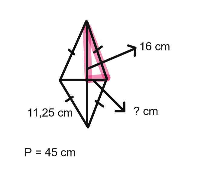 Ensuite, à l'aide de pythagore, tu peux calculer la valeur de la cathète d'un triangle à l'intérieur du losange, l'autre cathète étant 8cm (16cm/2=8cm). En multipliant la valeur obtenue par 2, tu auras la valeur de la petite diagonale du losange.