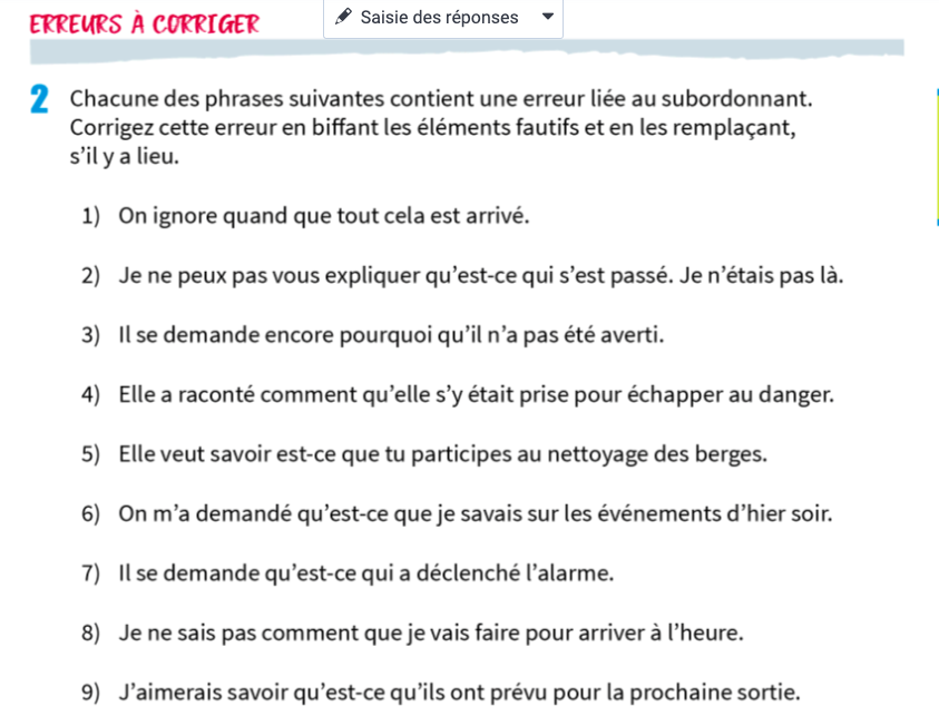 Dans chacun de ces exercices, on retrouve des erreurs liés au subordonnant que tu dois corriger. Voici un exemple (numéro 1)