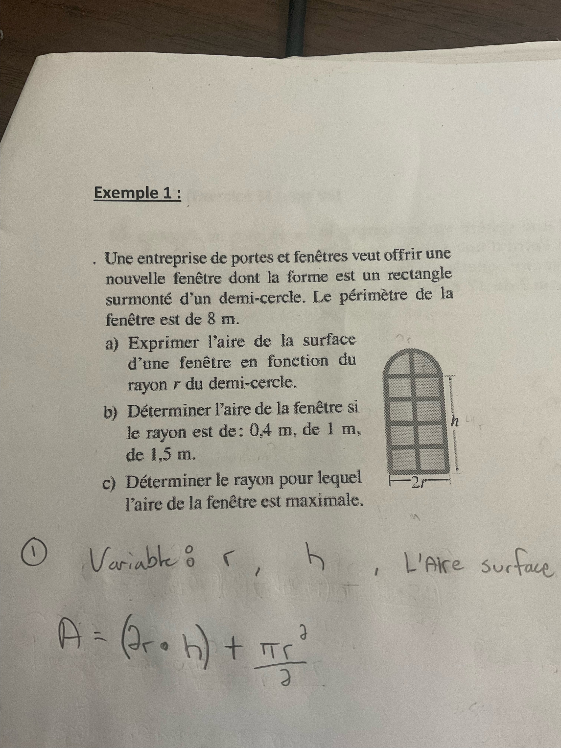 En a) il faut compléter en isolant h dans la formule du périmètre et en le remplaçant dans l'équation de l'aire.