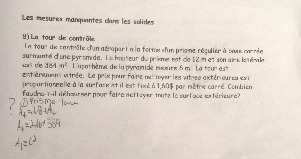 L'aire en vitre à nettoyer est l'aire latérale de la pyramide + aire latérale du prisme