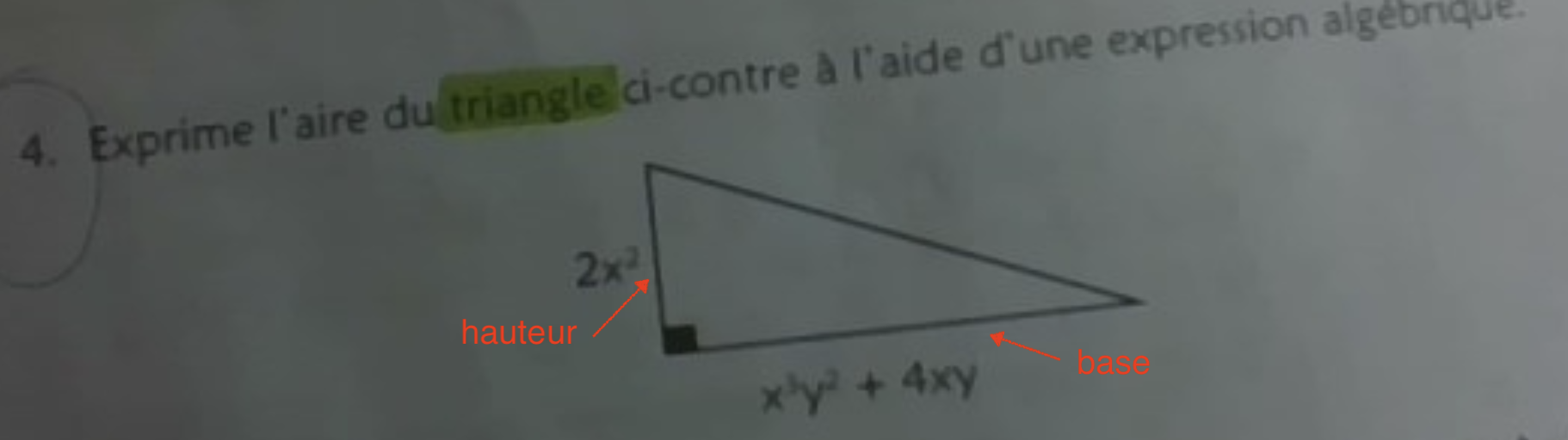 Ensuite, il est important d'identifier les variables pour faciliter le calcul! Donc, la base (b) est x^3y^2 + 4xy et la hauteur (h) est 2x^2. (Les ^ sont pour indiquer les exposants puisque l'option de faire des exposants n'est pas disponible sur mon clavier)