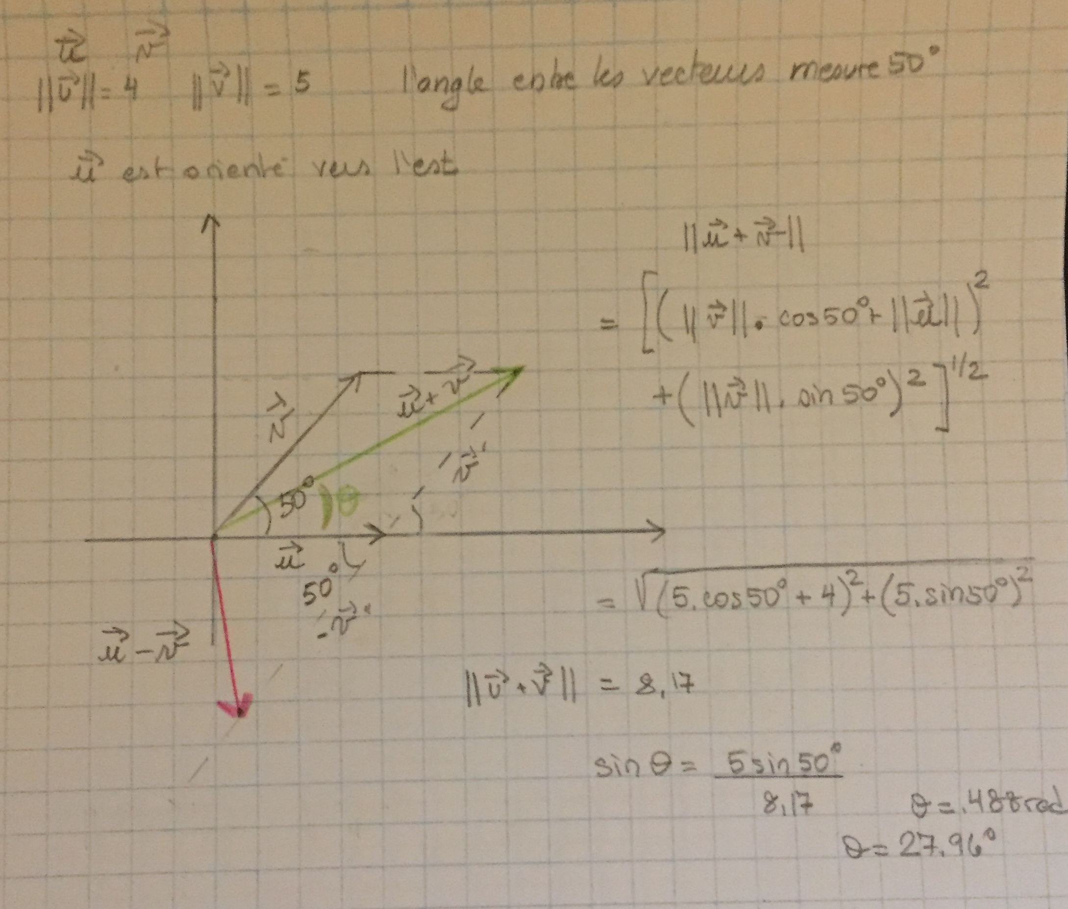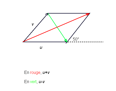 Pour une solution géométrique avec loi des cosinus et loi des sinus, voici la représentation des vecteurs: