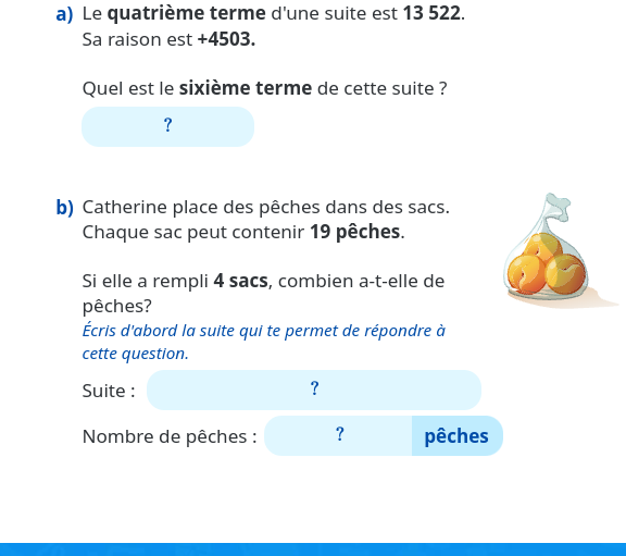 Le nombre de sac est le rang et le nombre de pêche est le terme. Je te laisse essayer de répondre à cette question par toi-même.