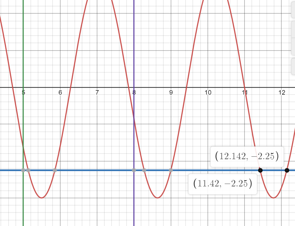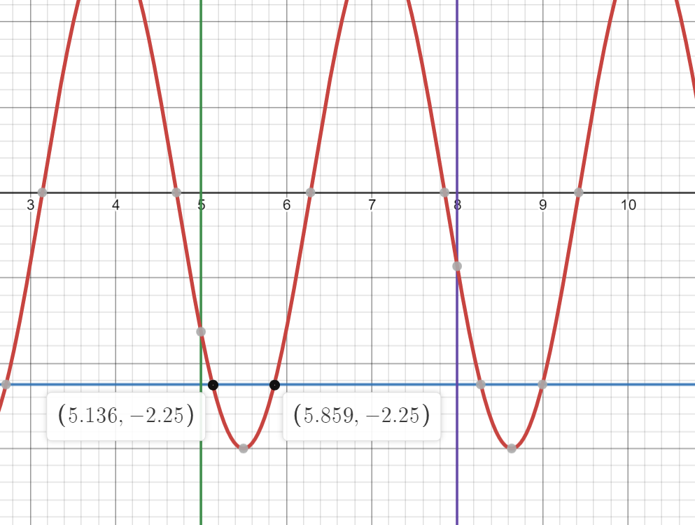 En gros, on cherche les points de la fonction -3sin(-2(x-4pi)) passant par y=-2,25.
