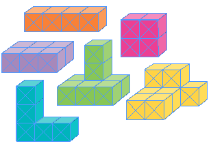 On peut calculer le volume en nombre de petits cubes. Le solide orange et le rose ont un volume de 4 cubes, le vert de 8 cubes, etc. On comptant le nombre de cubes, je suis en train de mesurer l'espace qu'occupe l'objet, et donc son volume!