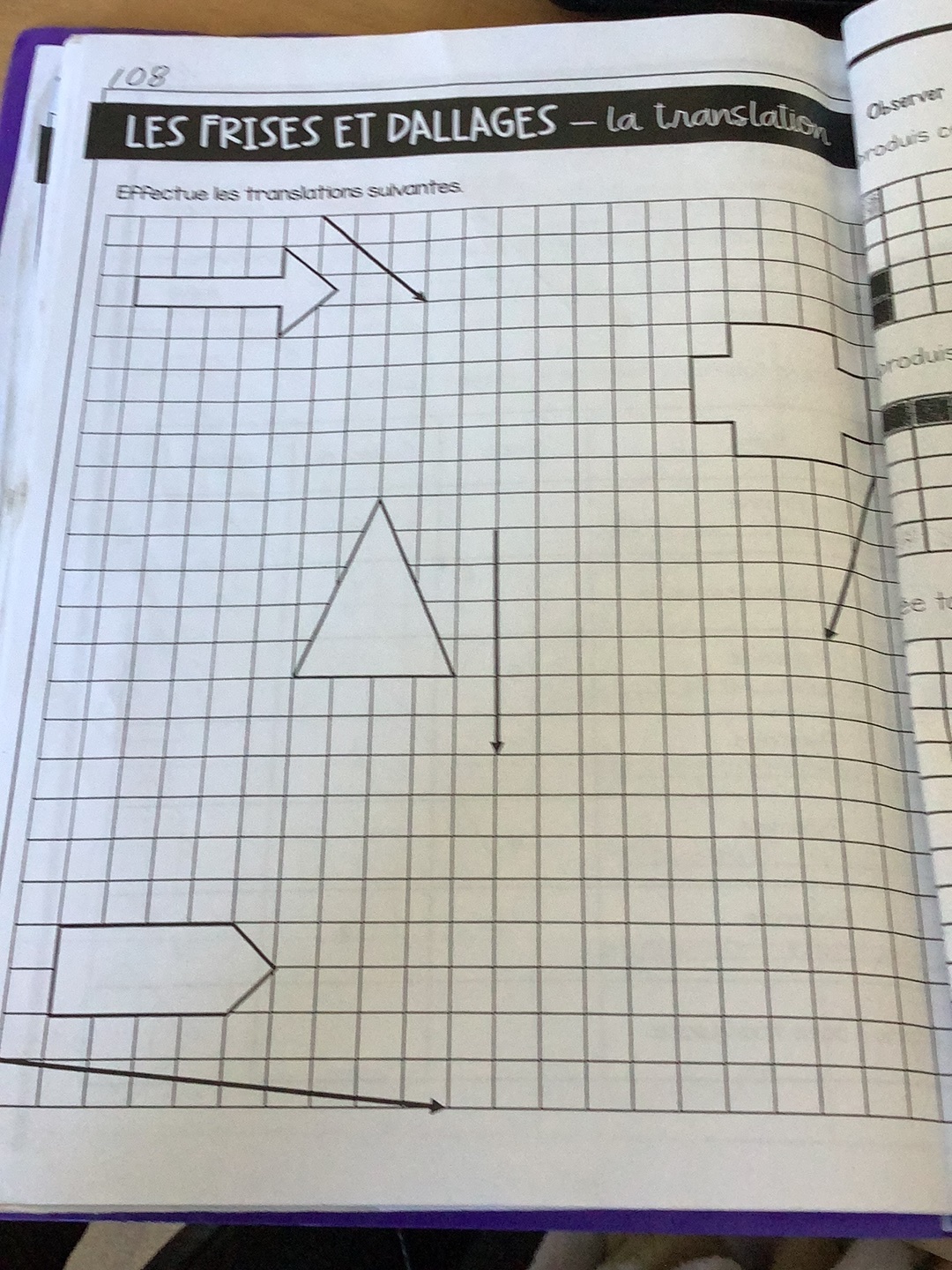 Pour ce numéro, il va falloir que tu reproduises les figures qui te sont montrer. Les flèches sont des indices pour le faire. Si une flèche mesure 5 carrés, il va falloir que tu reproduise ta figure 5 carrés plus loin. De plus, la direction de cette dernière (flèche) t'indique de quel côté il va falloir la re faire. Ainsi, si la flèche indique vers la droite et mesure 5 carrés, il va falloir que tu re dessines la figures vers la droite, 5 carrés plus loin.
